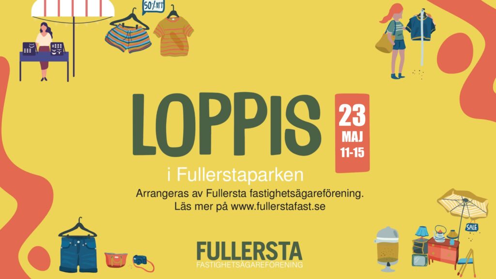 Den 23 maj, mellan klockan 11 och 15, kommer Fullersta Fastighetsägareförening att arrangera loppis i Fullerstaparken! För våra medlemmar är det kostnadsfritt att delta som säljare (övriga är också välkomna men betalar då 150 kronor). Du behöver bara ta med dig ditt eget bord, en klädhäst, några lådor eller vad du anser passande.